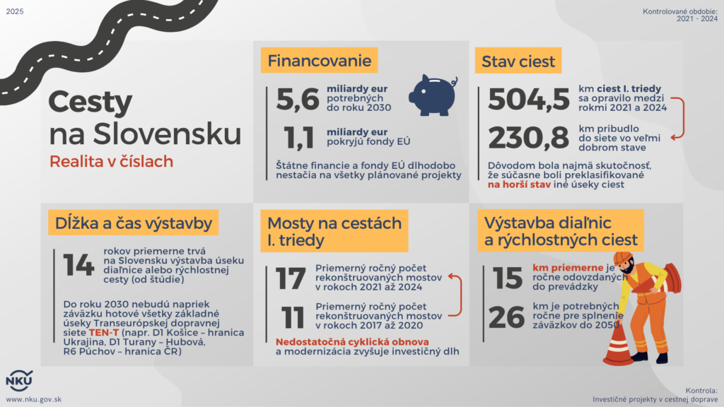 Najvyšší kontrolný úrad (NKÚ) v správe konštatuje, že mosty sú kritickým miestom pre udržanie bezpečnej a dostupnej dopravnej infraštruktúry a sú dlhodobo neriešené. Problém podľa úradu komplikuje roztrieštená správa. Menší správcovia totiž často nemajú ani financie, ani personálne kapacity na systematickú údržbu.