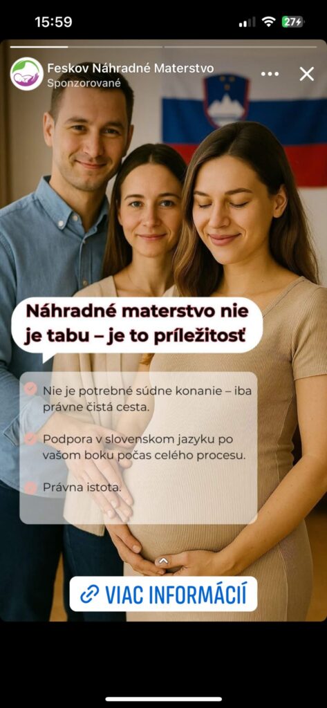 V lete sa na slovenskom Facebooku začala objavovať kampaň, ktorá ponúka možnosť zaobstarať si dieťa formou takzvaného surogátneho (náhradného) materstva. Na Slovensku ide pravdepodobne o prvý známy prípad, kedy sa potenciálnym rodičom ponúka tento druh „produktu“ priamou marketingovou kampaňou.
