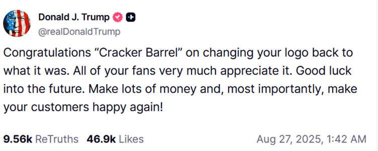 Manažment prvé dni tvrdohlavo trval na zmene, ale po týždni kapituloval a vrátil sa k pôvodnému logu. Reštauračnej sieti k tomuto rozhodnutiu zagratuloval aj 47. prezident USA a jej akcie okamžite poskočili o 8 percent.