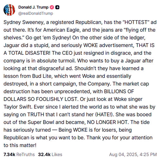 Podobný príbeh, ale v opačnom garde, sa odohral len pár týždňov predtým. Odevná spoločnosť American Eagle uverejnila novú reklamu na svoje džínsy. Herečka Sydney Sweeneyová sa v nej vyzývavo venuje údržbe klasického Fordu Mustang.