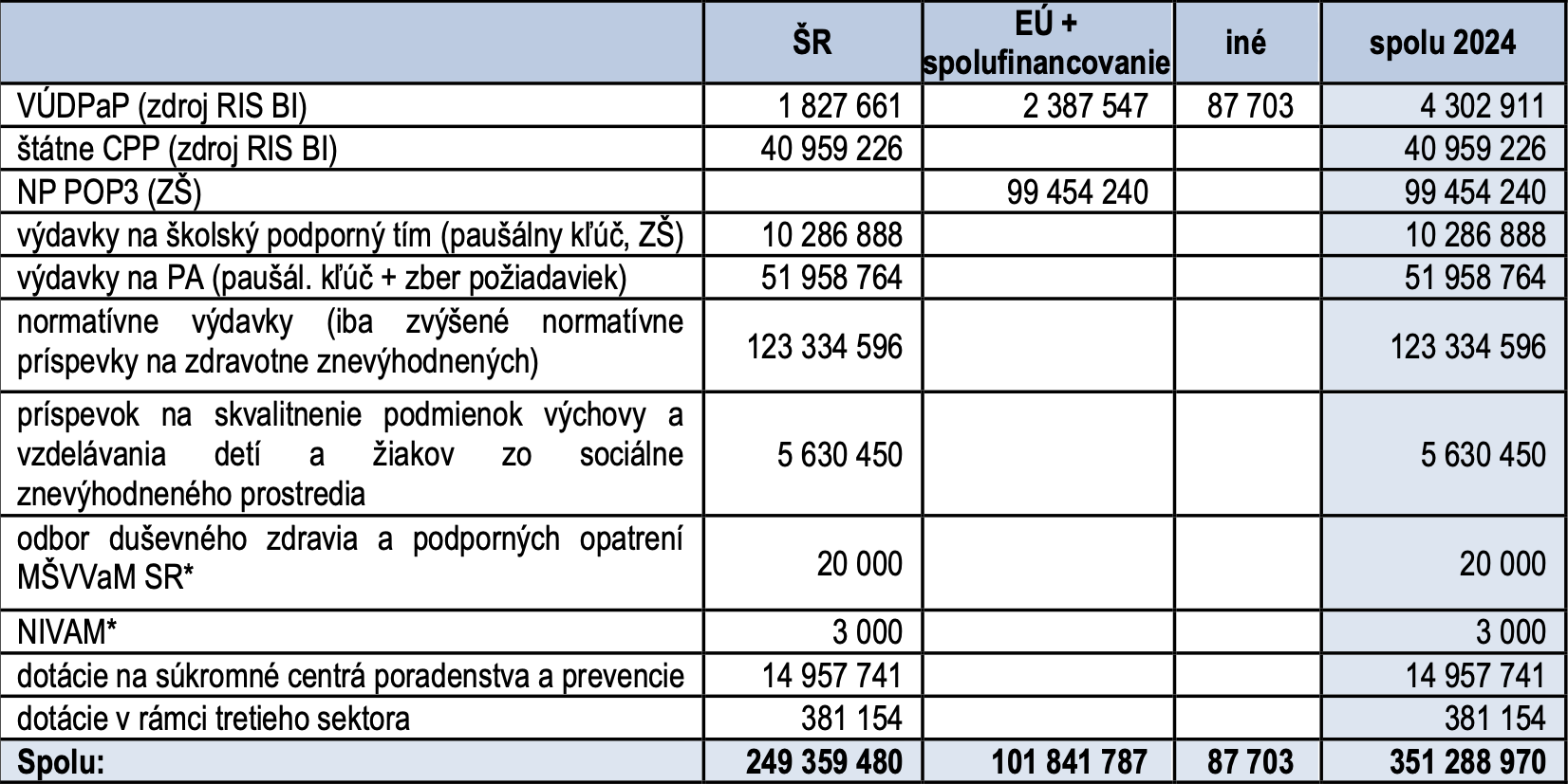 Ako bližšie ukazuje tabuľka, financie smerovali na výdavky na školské podporné tímy, pedagogických asistentov či organizácie ako VÚDPaP a centrá poradenstva a prevencie.
