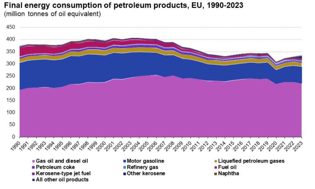 V roku 2023 sa v EÚ spotrebovalo 219 miliónov ton nafty, čo je o 16 percent menej oproti historickému vrcholu z roku 2006. Spotreba kopíruje veľkosť ekonomiky štátov, takže na čele je Nemecko, za ním nasledujú Francúzsko, Taliansko a Španielsko.