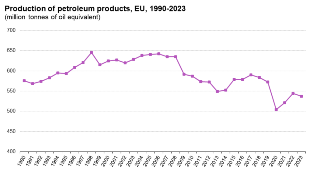 Nemecko má so šestinovým podielom zároveň najväčšie rafinérske kapacity v EÚ. Vyrobí zhruba 38 miliónov ton nafty z 214 miliónov vyrobených v EÚ. Čistý rozdiel medzi spotrebou a výrobou nafty v EÚ je tak zhruba len päť miliónov ton. Potreba čistého dovozu nafty do EÚ sa dlhodobo pohybuje niekde medzi piatimi až desiatimi percentami spotreby.