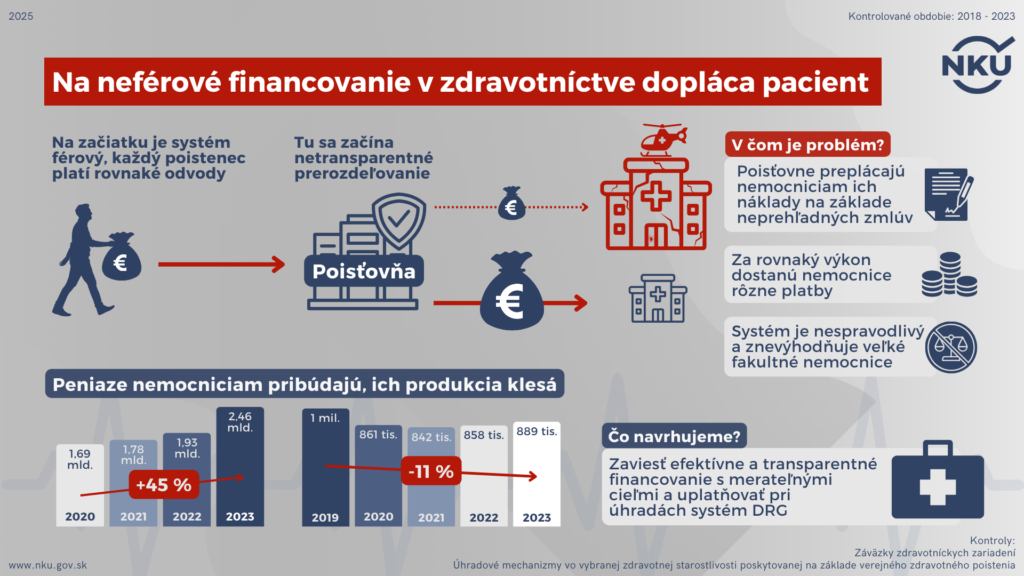 Že štát ťahá za kratší koniec, potvrdzuje aj správa Najvyššieho kontrolného úradu (NKÚ), podľa ktorej každá poisťovňa platí každej nemocnici inak. Štátna VšZP preplatila v rokoch 2019 až 2023 súkromné zdravotné poisťovne v oblasti ústavnej zdravotnej starostlivosti o 333 miliónov eur.