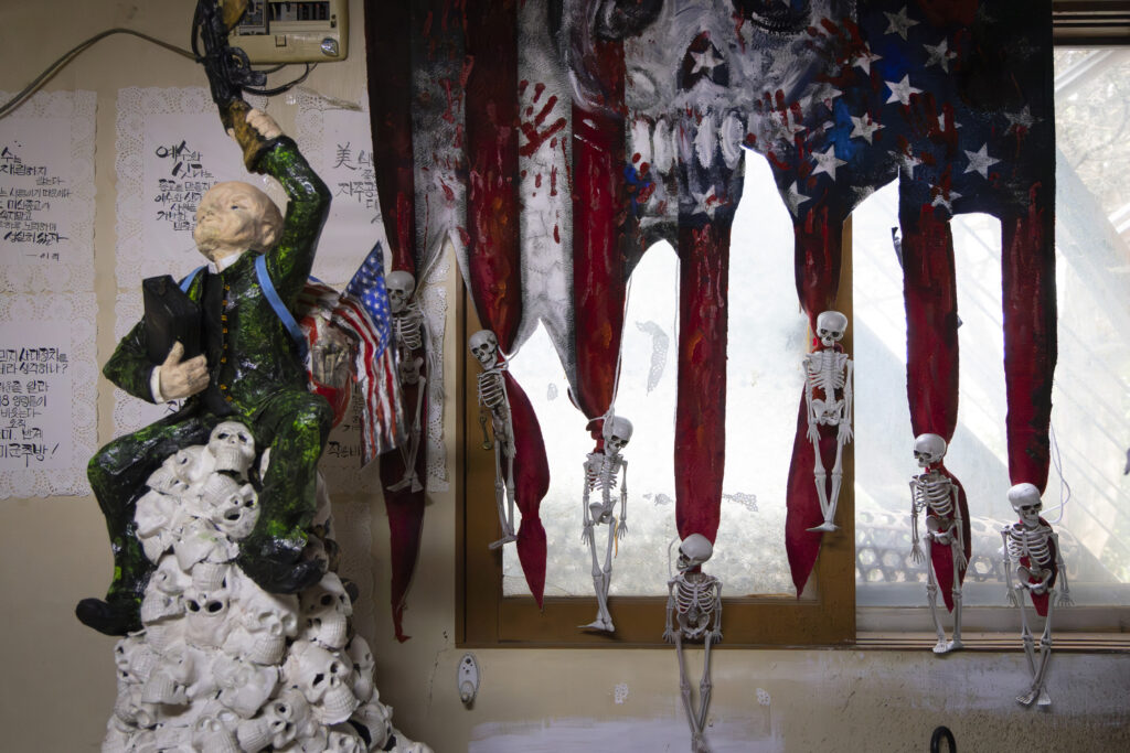 „Stále sa snažím pochopiť niečo, čomu hovoria kapitalizmus,“ povedal 95-ročný pán Ahn. Na stenách okolo neho viseli papierové figúrky zosmiešňujúce strýka Sama a Sochu slobody. Boli zobrazení ako chamtiví, samopalmi ozbrojení a krvilační vojnoví štváči. „Ľudia v Južnej Kórei si neuvedomujú, že sú otrokmi v kolónii a ich vodcovia nič nemôžu urobiť bez súhlasu Američanov.“