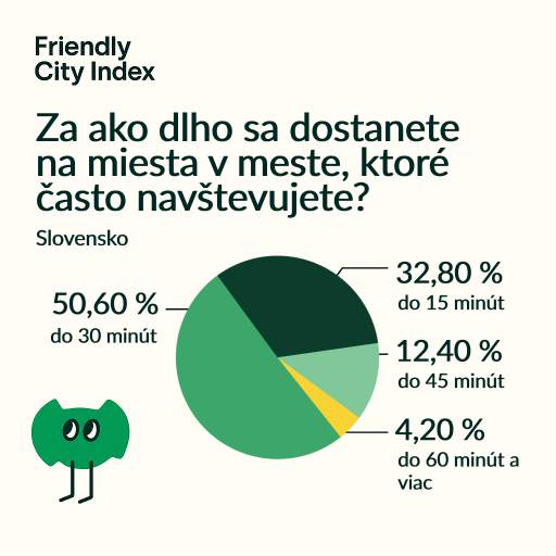 Medzinárodný výskumný projekt Friendly City Index sa zameral na obyvateľov miest Slovenska a čas, za ktorý prídu peši, na bicykli alebo verejnou dopravou do svojho každodenného cieľa - čiže do práce, do školy, k lekárovi, do obchodu či na úrady.
