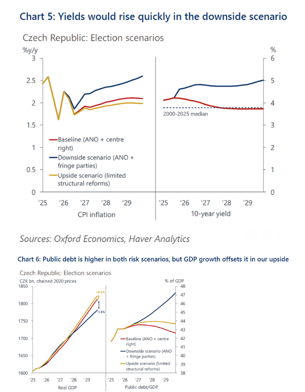 Oxford Economics v aktuálnej analýze predpokladá, že hnutie ANO vytvorí koalíciu s jednou zo stredopravicových strán z doterajšej vlády. To by bol pre trhy najpriaznivejší scenár, pretože by brzdil rozpočtové uvoľnenie, s ktorým ANO počíta.