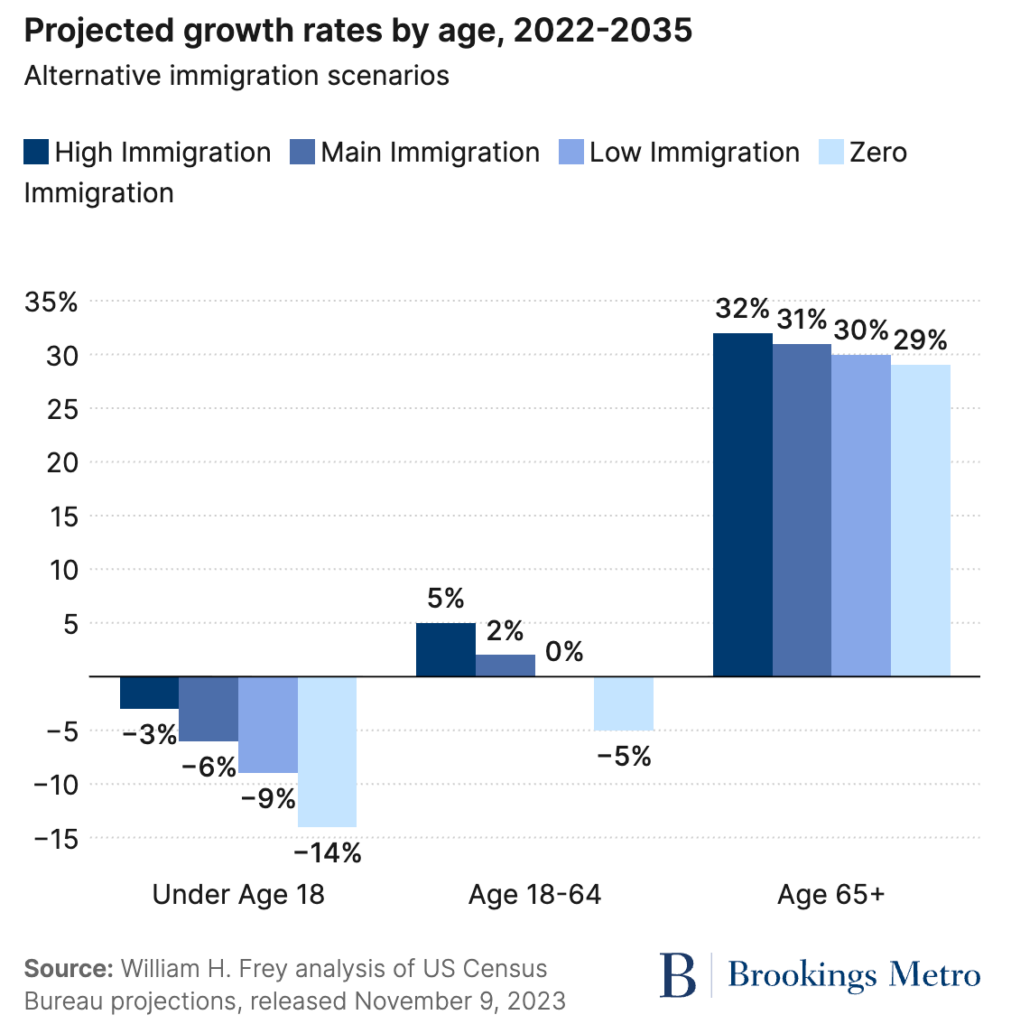 V dlhodobom politickom prostredí, ktoré by bolo nepriateľské voči prisťahovalectvu, by sa tento pomer mohol priblížiť až k jednej osobe na jedného príjemcu. Stagnácia obyvateľstva sťaží financovanie sociálneho zabezpečenia, zdravotného poistenia, zdravotnej starostlivosti a ďalších prvkov americkej bezpečnostnej siete, najmä v období vysokých deficitov a vysokých úrokových sadzieb. Toto rozpočtové napätie by si časom mohlo vyžiadať, aby politici buď zvýšili dane vyššej strednej triede, alebo znížili dávky pre starších občanov.