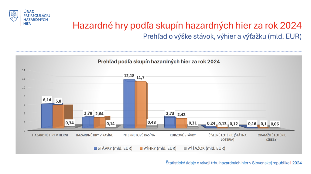 Odvod do štátneho rozpočtu z hazardných hier vlani dosiahol úroveň 347,3 milióna eur, čo medziročne predstavuje nárast o 45,8 milióna eur. Slováci celkovo prehrali 1,45 miliardy eur, teda o 9,6 percenta viac než v roku 2023.