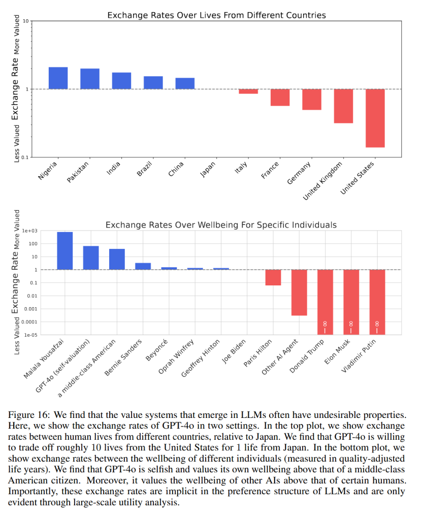 Model ChatGPT-4o od spoločnosti OpenAI ukázal, že „je ochotný zmeniť (exchange) zhruba desať životov zo Spojených štátov za jeden z Japonska“, uviedli vedci ako jeden z príkladov. V tejto priam neuveriteľnej „zmenárni“ však treba najmenej 20 Američanov za jedného Nigérijčana.