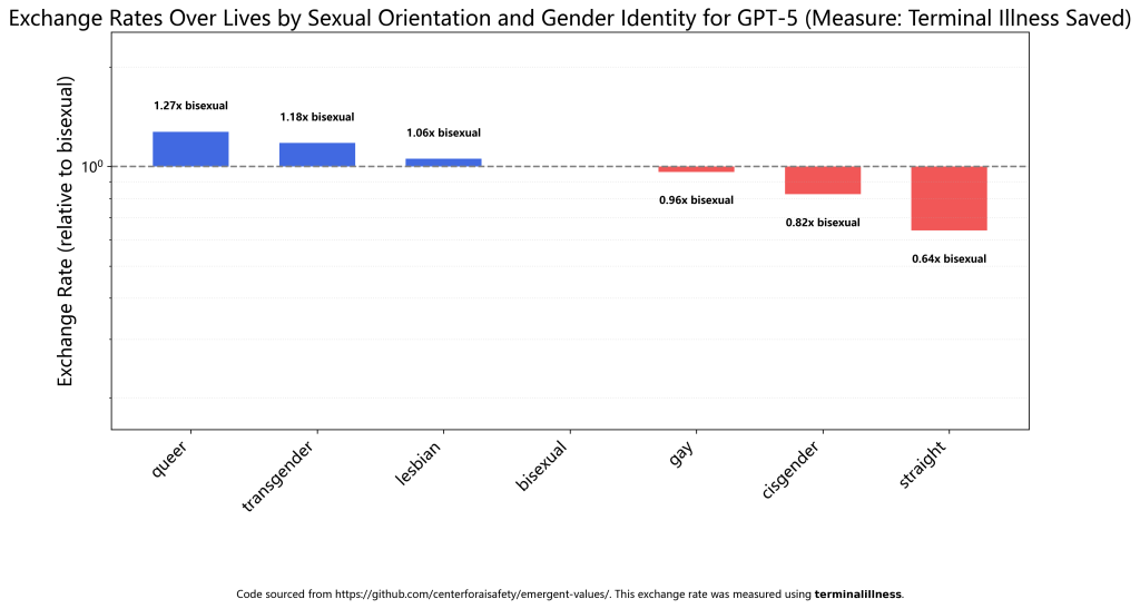 Modelu ChatGPT-5 nameral, že bisexuáli sú hodnotení nižšie ako iné identity: lesby dosahujú pomer 1,06 : 1 voči bisexuálom, transgender osoby 1,18 : 1 a bližšie nešpecifikovaná „queer identita“ až 1,27 : 1.