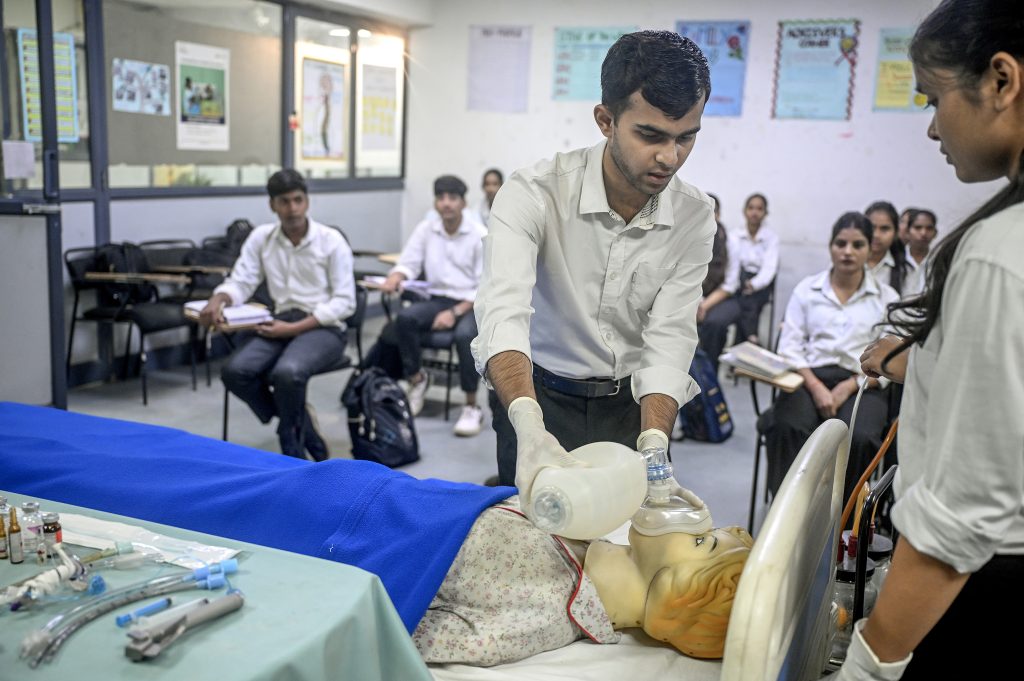 Dvadsaťročný Riteš Džagra študuje chirurgické postupy v učebni Inštitútu Learnet. Sedí vzadu a sleduje, ako jeho spolužiak pripravuje figurínu na operáciu.