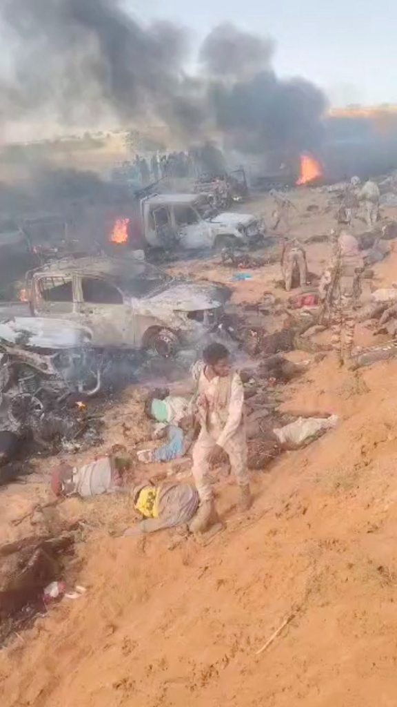 Príslušníci Rýchlych podporných síl (RSF) medzi telami pri meste Fášir 27. októbra 2025. Foto: Reuters