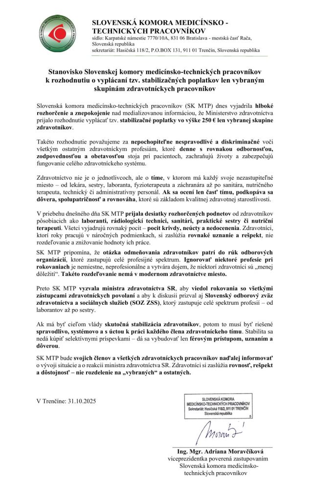 Aj Slovenská komora medicínsko-technických pracovníkov nesúhlasí s tým, že ministerstvo zdravotníctva rozhodlo o vyplácaní príspevkov vo výške 250 eur mesačne len niektorým zdravotníkom.