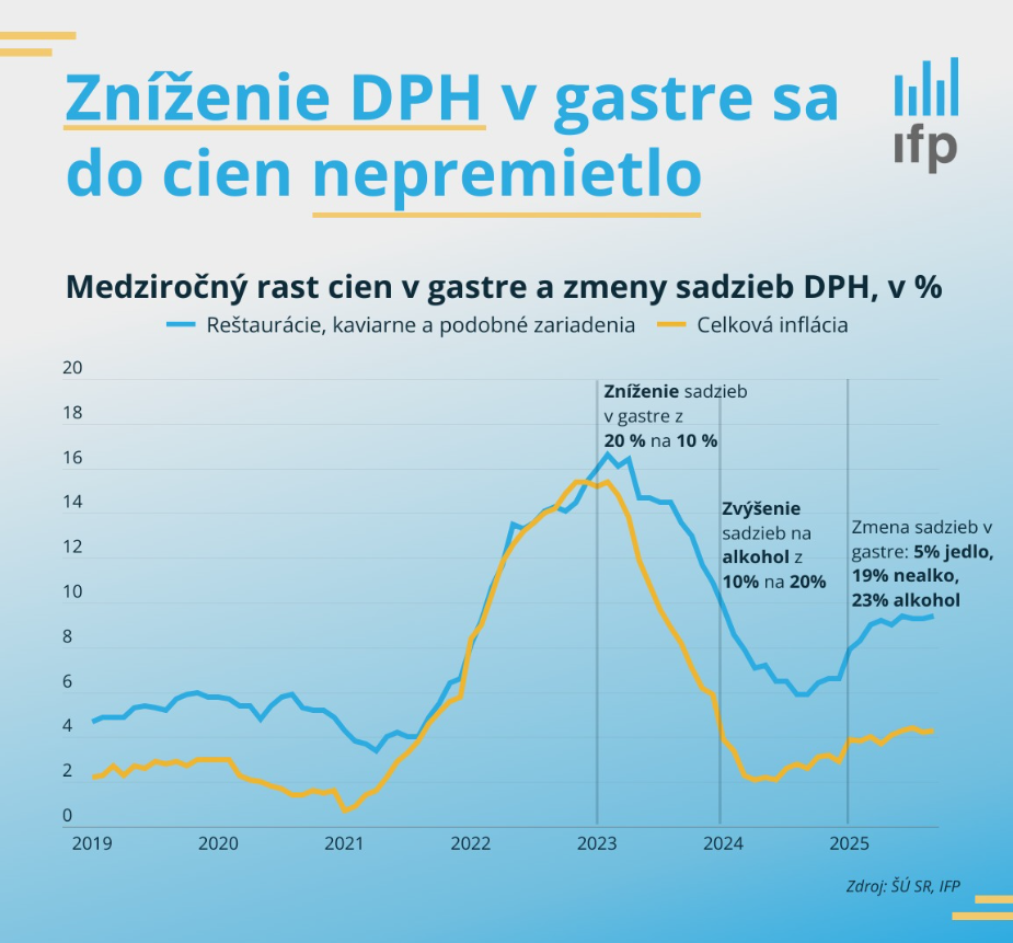 Gastro sa tak zaradilo medzi najdynamickejšie zdražujúce služby, hoci by teoreticky malo byť pod menším tlakom práve kvôli nižšej DPH. Podľa IFP ďalším komplikujúcim faktorom je, že gastrosektor dnes funguje s až tromi sadzbami DPH (päť percent na jedlo, 19 percent na nealko a 23 percent na alkohol).