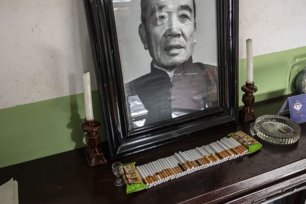Jeho dvaja synovia odišli z Ta-čaj hľadať prácu inde – jeden sa stal vodičom, druhý pracuje v uhoľnej bani. „Mladí už nechcú robiť na poliach,“ hovorí. V jednoizbovom dome, ktorý zdieľa s manželkou, visia plagáty s Mao Ce-tungom a Si Ťin-pchingom, no tie zatieni veľký obraz Boha bohatstva.