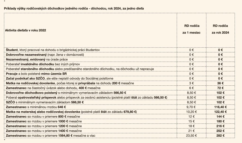 Sociálna poisťovňa im totiž automaticky vyplácala 1,5 percenta z vymeriavacieho základu ich dieťaťa, respektíve viacerých detí spred dvoch rokov. Výška dávky závisela od zárobku dieťaťa, pričom maximálny mesačný rodičovský dôchodok od jedného potomka bol vlani 23,50 eura.