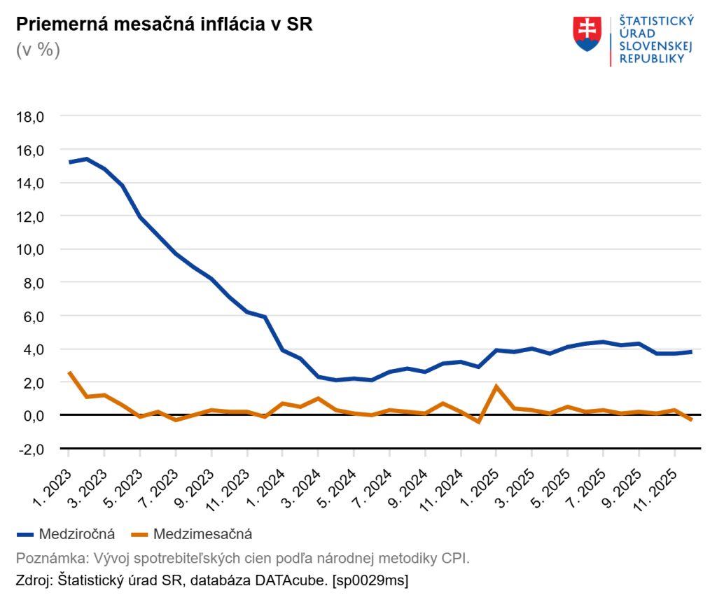 Spotrebiteľské ceny na Slovensku v decembri po prvýkrát v roku 2025 medzimesačne klesli. Na prvý pohľad to znie povzbudivo, no medziročne inflácia napriek tomu mierne zrýchlila. Podľa údajov Štatistického úradu SR dosiahla v decembri 3,8 percenta a priemer za celý rok 2025 sa tak zvýšil na štyri.