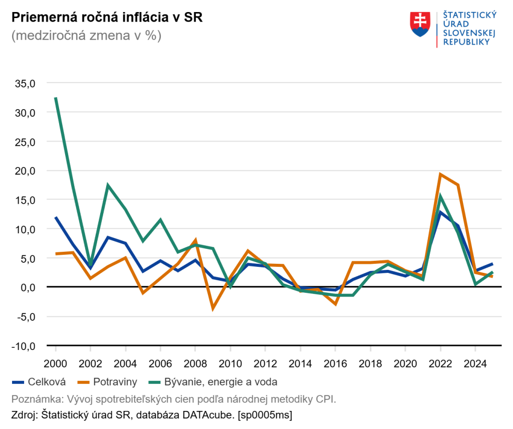 Okrem dát za posledný kalendárny mesiac vlaňajška priniesli štatistici aj celkové dáta za rok 2025. Priemerná ročná inflácia na Slovensku dosiahla štyri percentá. Oproti roku 2024, keď bola na úrovni 2,8 percenta, ide o citeľné zrýchlenie, zároveň však stále o výrazne miernejšie tempo než v inflačne vypätých rokoch 2022 a 2023.
