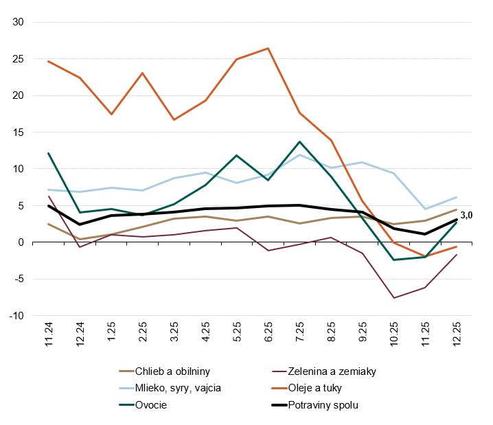 Práve potraviny s nealkoholickými nápojmi zaznamenali najvýraznejší pokles v minulom roku – o 0,6 percenta. V porovnaní s decembrom 2024 však išlo o podstatne menej výrazné zlacnenie, čo sa následne premietlo do rýchlejšieho medziročného rastu cien potravín, ktorý sa opäť priblížil k hranici troch percent.