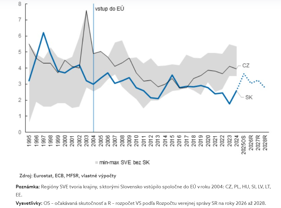 Bežné príjmy sotva pokrývajú bežné výdavky a takzvané hrubé úspory verejnej správy patria dlhodobo k najnižším v regióne. To výrazne obmedzuje schopnosť spolufinancovať investície či vytvárať vlastné investičné programy. V praxi to znamená, že bez externých zdrojov sa investičná aktivita štátu rýchlo dostáva do útlmu.