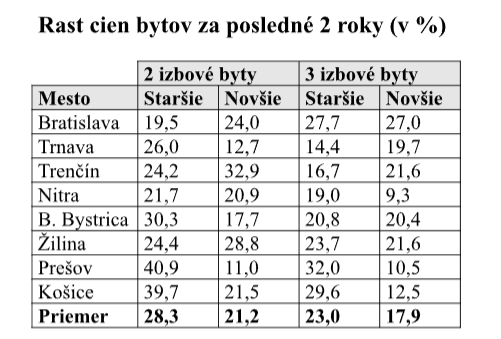 Aj podľa Realitného barometra Realitnej únie SR sa hodnoty bytov v krajských mestách za posledné dva roky zvýšili v priemere o 25,1 percenta, pričom len za minulý rok vzrástli takmer o 12 percent. Slovensko sa zároveň v treťom štvrťroku minulého roka zaradilo medzi krajiny s najvyšším medziročným rastom cien nehnuteľností v Európskej únii.
