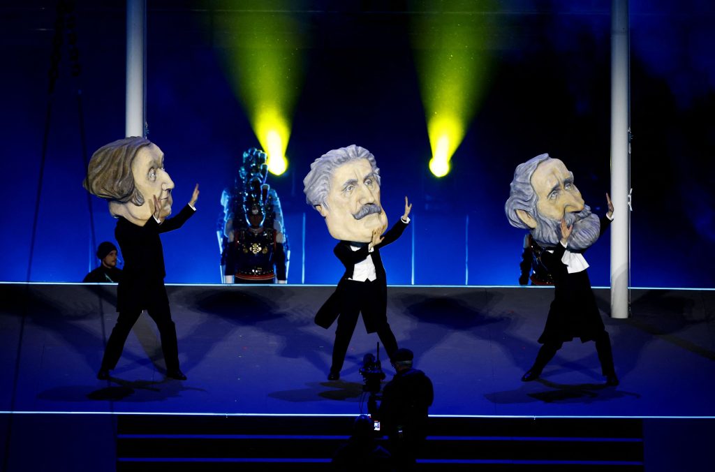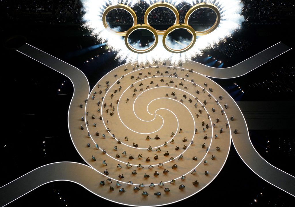 Umelci potom vyskočili z oboch kruhov a akrobatickým tancom sa spustili na zem. Medzitým na lanách organizátori spustili ďalšie tri kruhy, čím vytvorili symbol olympijských hier.