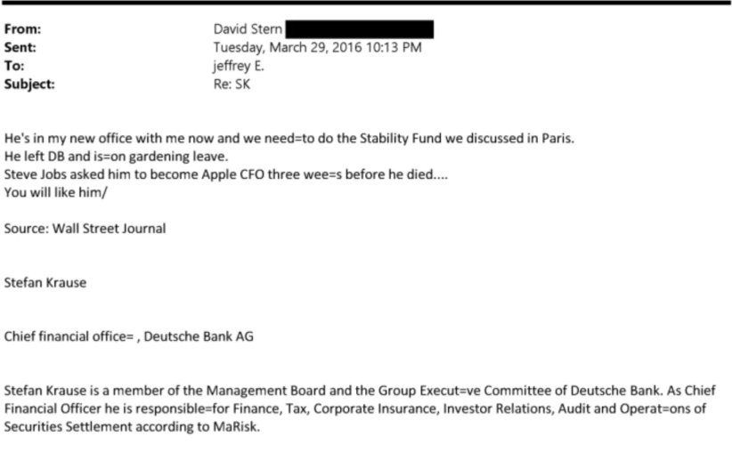 Dôležitú úlohu v Sternovom uvažovaní zohral Stefan Krause, bývalý finančný riaditeľ Deutsche Bank. Krause, ktorý krátko predtým opustil skupinu, mal povesť skúseného manažéra v medzinárodnom bankovníctve. Stern odporučil Krauseho Epsteinovi, keď mu ho predtým mimoriadne vychválil. Dokonca aj zakladateľ spoločnosti Apple Steve Jobs chcel krátko pred svojou smrťou vymenovať Krauseho za finančného riaditeľa technologickej spoločnosti, napísal Stern v e-maile.