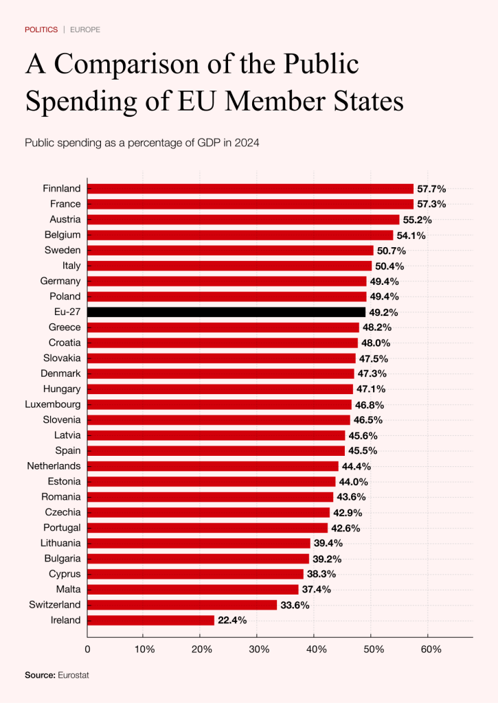Írsko patrí medzi najdynamickejšie ekonomiky v EÚ, pričom jeho reálny rast HDP v roku 2024 dosiahol 2,6 percenta, zatiaľ čo hospodárstvo Nemecka v rovnakom období kleslo o 0,2 percenta. V rámci 27 členských štátov EÚ bola priemerná úroveň tohto ukazovateľa v roku 2024 na 49,2 percenta, pričom Fínsko bolo na vrchole s 57,7 percenta. Slovensko je so 47,5 percenta necelé dve percentá pod priemerom európskej dvadsaťsedmičky.