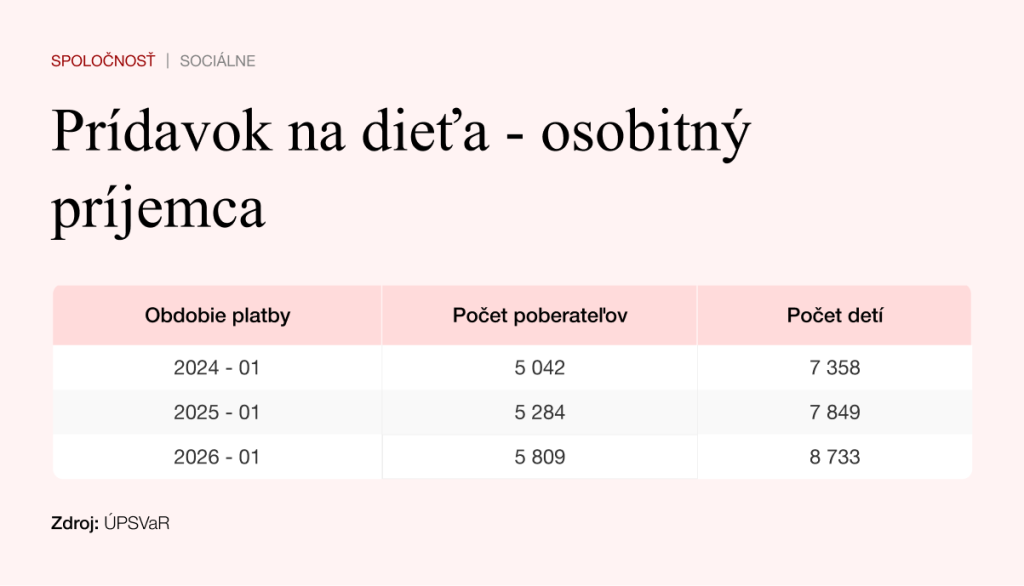 Ústredie práce, sociálnych vecí a rodiny informovalo Štandard, že do konca roka 2025 bolo pridelených 8 733 osobitných príjemcov. Znamená to o 900 detí viac ako rok predtým.