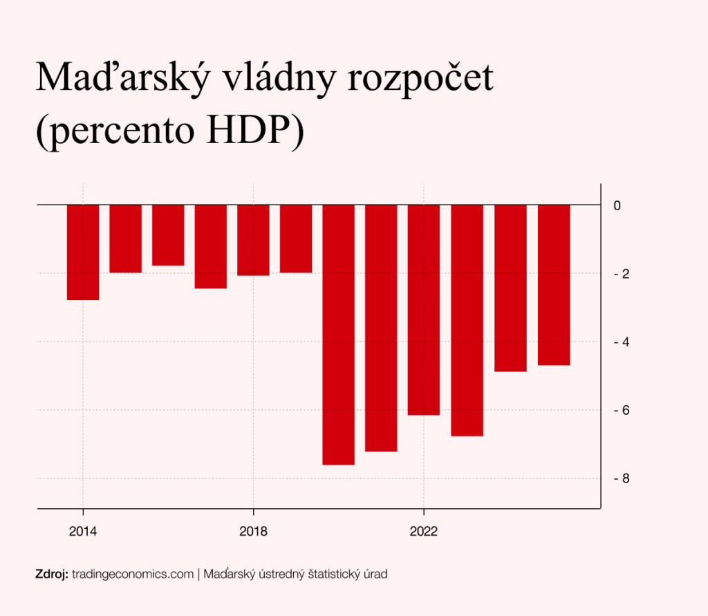 Zatiaľ čo v rokoch 2014 až 2019 sa Maďarsku darilo udržať deficit pohodlne pod maastrichtskými tromi percentami HDP, pandemický šok v roku 2020 vystrelil deficit na osem percent a odvtedy sa ho nedarí skrotiť. Aj v predvolebných rokoch 2024 a 2025 sa deficit tvrdohlavo držal na úrovni 4,5 percenta až päť percent HDP.