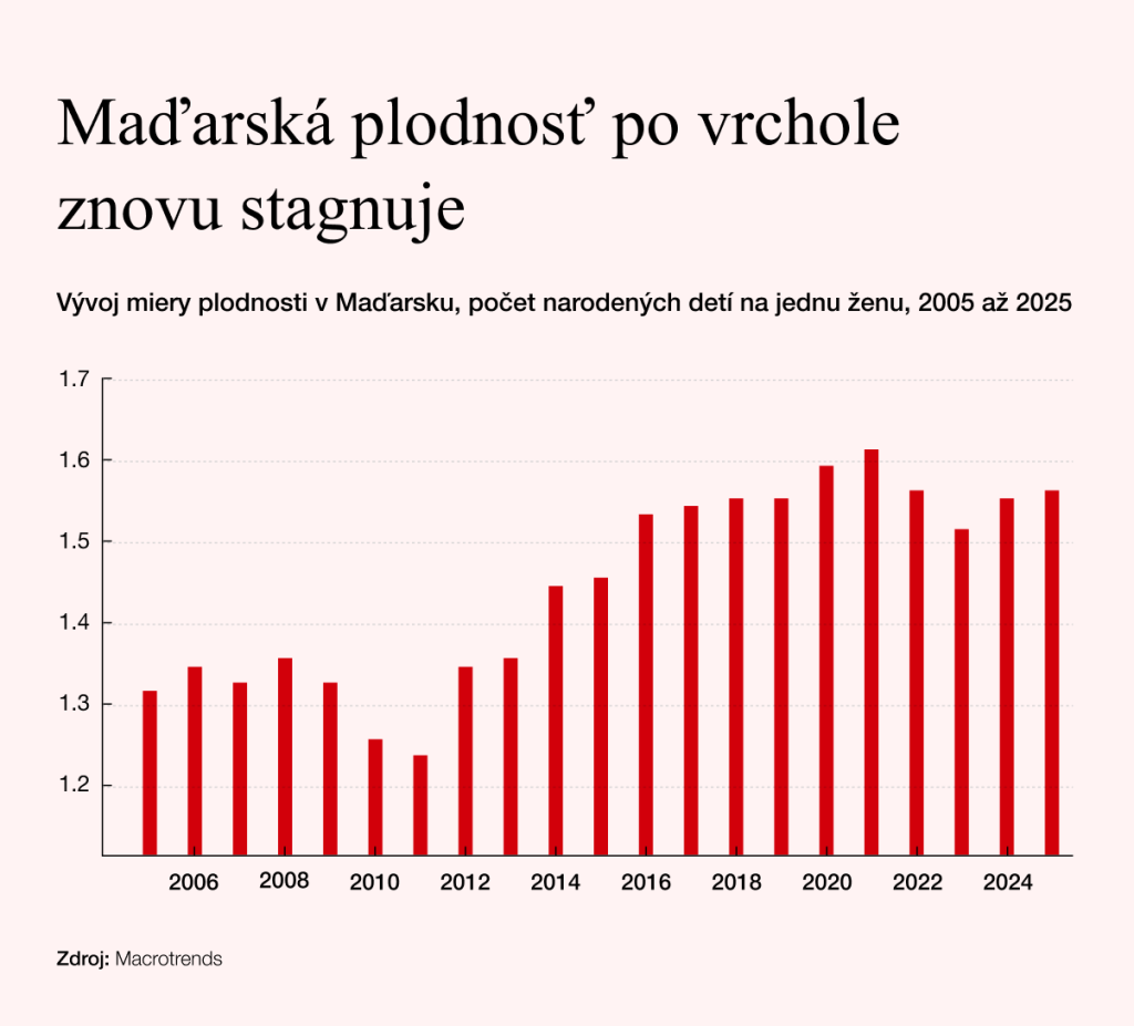 Na papieri to vyzeralo presvedčivo. Keď Orbán preberal krajinu v roku 2010, úhrnná plodnosť bola 1,25 dieťaťa na ženu. Do roku 2021 vzrástla na 1,59. Keby to fungovalo takto jednoducho, stačilo by mladé rodiny zasypať peniazmi. Lenže rodina nie je účtovný stroj, do ktorého z jednej strany vhodíte dotáciu a z druhej vypadne dieťa.