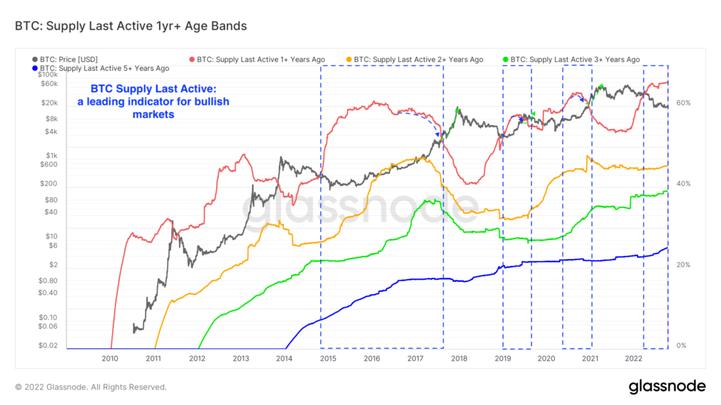 Všimnite si, ako 1+ ročné tokeny dosahujú vrchol počas dna medvedích trhov a prechádzajú krátko predtým, ako sa cena bitcoinu (čierna čiara) zmení z medvedej na býčiu. Dá sa predpokladať, že ak sú 1+ ročné tokeny vo vlastníctve držiteľov s nižšou istotou, títo držitelia počas medvedích trhov kapitulujú. Hneď, ako títo držitelia so slabšími rukami predajú, v podstate už nie sú žiadni predajcovia – a môže sa začať nový býčí trh. Pozrite sa, ako všetky línie v súčasnom období smerujú nahor. Ponuka bitcoinov naposledy aktívnych pred 1+ rokmi sa javí dobrým predikčným ukazovateľom pre býčie trhy (keď prejdú späť nadol).
