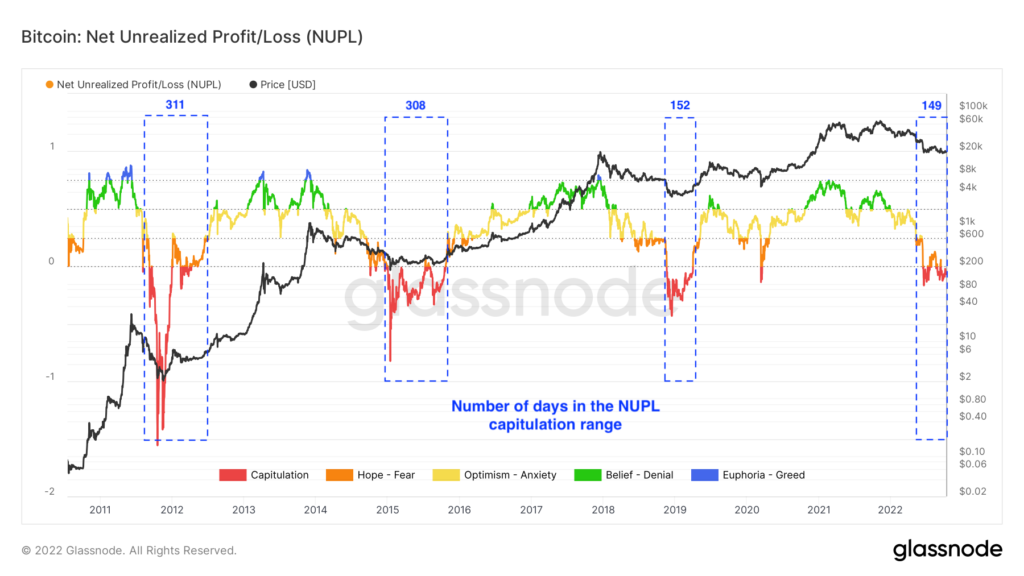 Druhou skutočnosťou je, že NUPL môže byť užitočný pri identifikácii väčších vrcholov a dien trhového cyklu. Keď sa pozrieme na čas, keď bol NUPL v kapitulácii v rokoch 2011, 2014 a 2019 – trh bol v kapitulácii v rozmedzí 152 až 311 dní – čo jasne koreluje s príslušnými dnami týchto trhových cyklov. Súčasné makroprostredie je pomerne medvedie, očakáva sa, že trh BTC bude v dohľadnej budúcnosti pokračovať v čistej nerealizovanej strate.