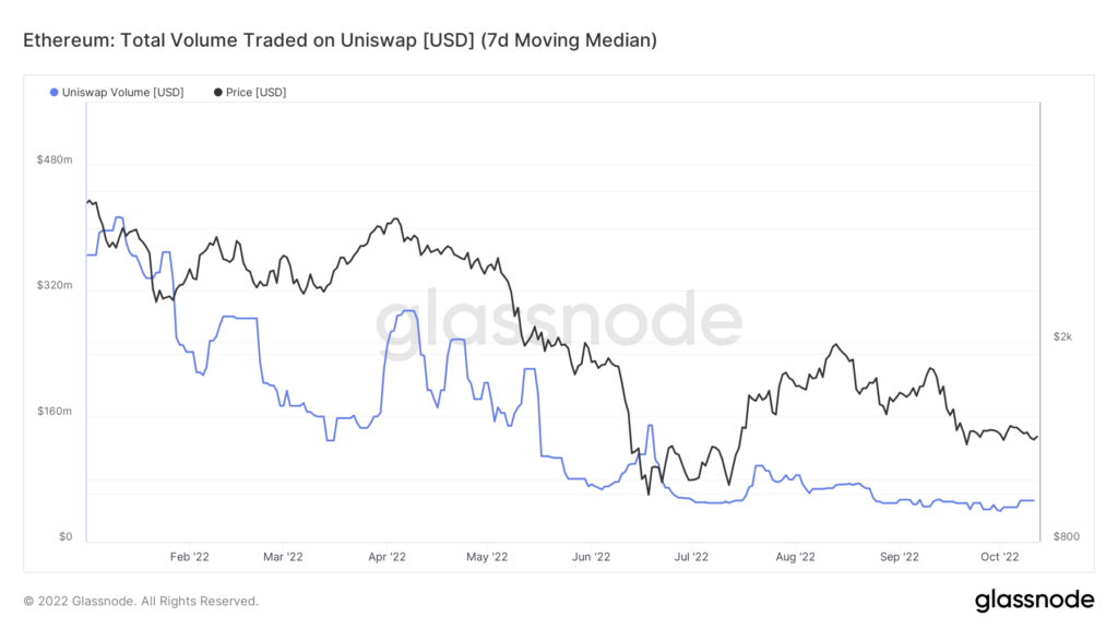 Celkový objem transakcií na burze Uniswap (7-dňový) vzrástol v porovnaní s predchádzajúcim týždňom o 33 percent, z najnižšej hodnoty od začiatku roka – 33 miliárd dolárov 1. októbra – na 52 miliárd dolárov 10. októbra. Keďže likvidita presakuje do cenovo efektívnejších Layer-2 reťazcov (t. j. Arbitrum/Optimism), dochádza k ďalšej fragmentácii likvidity v rámci ekosystémov. To sa odráža na reťazci, keďže celkové objemy transakcií na burze Uniswap pokračujú v 4. štvrťroku v klesajúcom trende, zatiaľ čo Optimism/Arbitrum zaznamenali rekordné objemy transakcií.