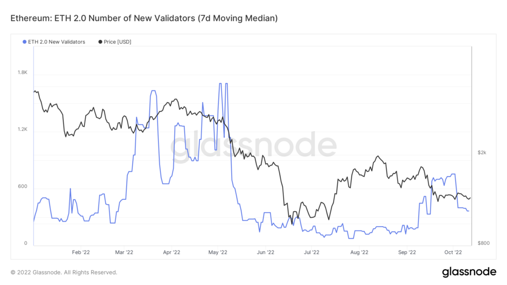 Počet nových validátorov zaznamenaných v sieti Ethereum sa po zlúčení 15. septembra znížil o 50 percent. Aktuálne výnosy zo stávkovania s hodnotou 4,78 percenta v podmienkach rozsiahleho negatívneho makroekonomického pozadia a zvýšenej korelácie naprieč rizikovými aktívami zostávajú neatraktívne. V súčasnosti počet nových validátorov klesol zo 750 koncom septembra na 365 10. októbra. Na reťazci sa tiež prejavuje minimálny nárast stávkového pomeru etherea (12,1 percenta), čo potvrdzuje nízke osvojenie.
