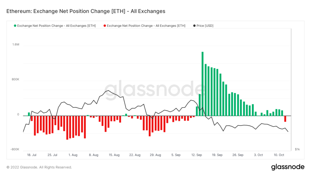 Promptný predajný tlak klesá, keďže sa prietok na burze začiatkom októbra zmenil z 1,5 milióna ETH/deň na -130 tisíc ETH/deň