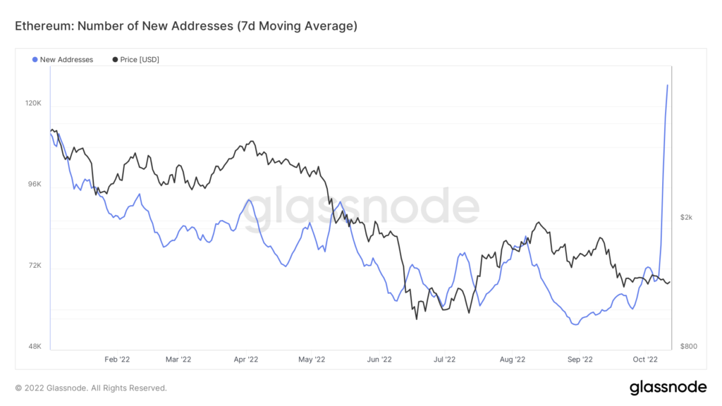 Prudký nárast počtu nových adries na sieti Ethereum, ktorý začiatkom októbra dosiahol ročné maximum 120-tisíc adries za týždeň