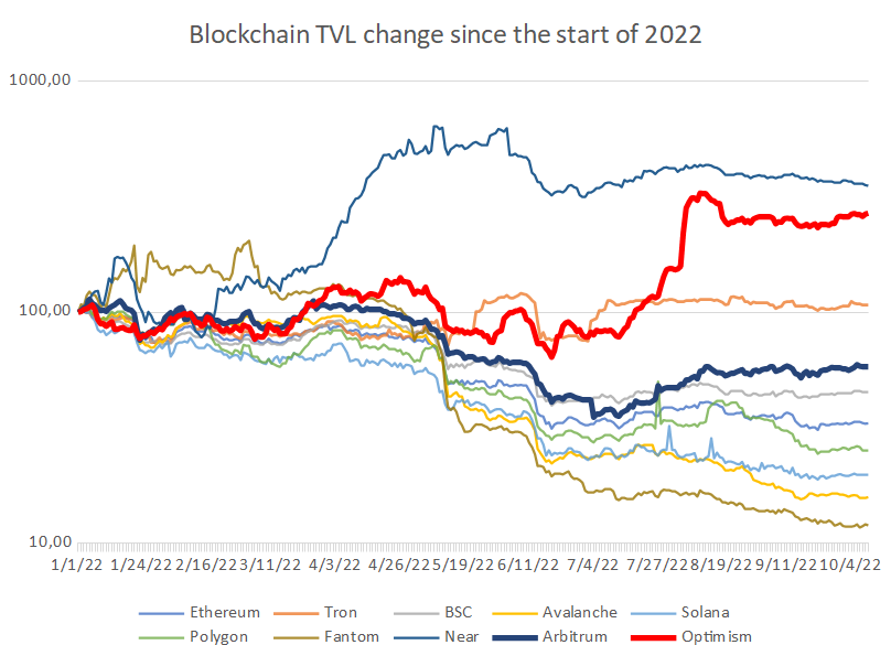 Takmer každý hlavný L1 zaznamenal v priebehu roka 2022 prudké zníženie TVL. Z desiatich najväčších blockchainov podľa TVL zaznamenali od januára nárast TVL len Near a Tron. Optimism dokázal od začiatku roka zvýšiť svoju TVL približne o 170 percent. Zatiaľ čo TVL pre Arbitrum od začiatku roka klesla o 42 percent, Ethereum, BSC, Avalanche, Solana, Polygon a Fantom zaznamenali ešte väčší pokles TVL. Od októbra 2022 patria Arbitrum a Optimism medzi 10 najväčších blockchainov podľa TVL, každý s celkovou vloženou hodnotou takmer 1 miliardy dolárov.