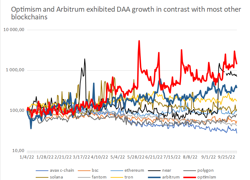 Od začiatku roka vzrástol počet DAA na blockchaine Optimism o 1 321 percent a na blockchaine Arbitrum o 263 percent. Optimism zvýšil počet DAA výrazne viac ako Arbitrum, ale začal rok na nižšom základe. K 8. októbru 2022 sú DAA pre Optimism a Arbitrum takmer rovnaké, a to 27 719 (Optimism) a 33 905 (Arbitrum). Napriek pôsobivému rastu však DAA Optimism a Arbitrum stále predstavujú len 5 až 6 percent DAA siete Ethereum. DAA Optimism a Arbitrum sú na rovnakej úrovni ako C-chain od Avalanche a Fantom.