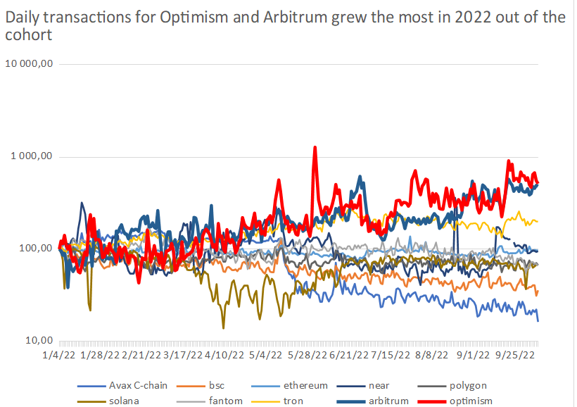 Optimism a Arbitrum zvýšili denné transakcie o 416 percent a 385 percent. K 8. októbru 2022 dosiahli Optimism 196 000 a Arbitrum 224 000 denných transakcií. Denné transakcie Optimism a Arbitrum predstavujú 17 percent a 19 percent denných transakcií Etherea. Denné transakcie v blockchainoch Optimism a Arbitrum sú takmer dvakrát vyššie ako transakcie na C-chain od Avalanche, hoci sú len polovičné v porovnaní s blockchain databázou Fantom.