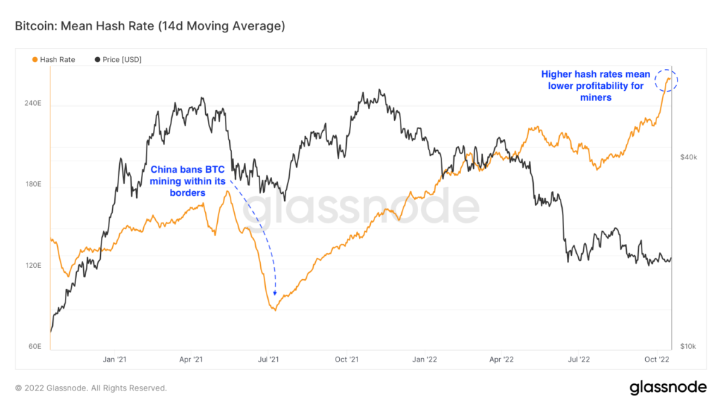Odvtedy sa hash rate viac ako zotavil, a teraz je na nových historických maximách, čo pre niektorých baníkov predstavuje potenciálne riziko vypnutia ťažobných zariadení z dôvodu nižšej ziskovosti. Na trhu sa začali objavovať nové ťažobné zariadenia, ktoré majú o 40 percent vyššiu účinnosť pri spotrebe elektrickej energie o 15 percent nižšej. To nepochybne zvýši tlak na baníkov používajúcich staršie zariadenia, aby premiestnili svoje ťažobné zariadenia do jurisdikcií s nižšími nákladmi na energiu alebo aby ukončili ťažbu. Táto zmena dynamiky nemusí nevyhnutne predstavovať riziko pre infraštruktúru a bezpečnosť siete Bitcoin, ale mohla by vytlačiť nadšencov a oportunistických baníkov, ktorí na ťažbu BTC používajú staršie zariadenia. Analýza hash rate nemá vplyv na pohyb ceny tokenu, zmeny hash rate však môžu informovať investorov o príleve alebo odleve investícií do siete.