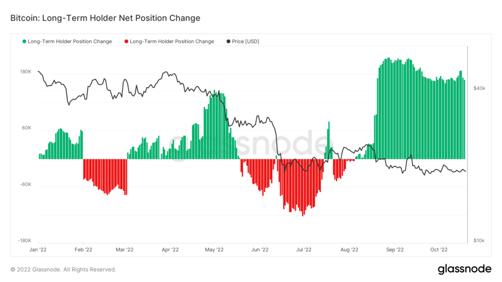 Dlhodobých držiteľov možno považovať za inteligentných a skúsených investorov v sieti BTC, a preto môžu poskytnúť určitý prehľad o náladách na trhu, najmä pozorovaním ich správania. Dlhodobí držitelia zvyčajne nakupujú BTC počas medvedích období a predávajú svoje mince so ziskom počas býčích období. V súčasnosti dlhodobí držitelia nakupujú – čo je dobrý náznak toho, že veria, že dno je už dosiahnuté alebo veľmi blízko. Silná akumulácia zo strany kohorty dlhodobých držiteľov je silným signálom, že neskôr sa v cykle očakávajú vyššie ceny.