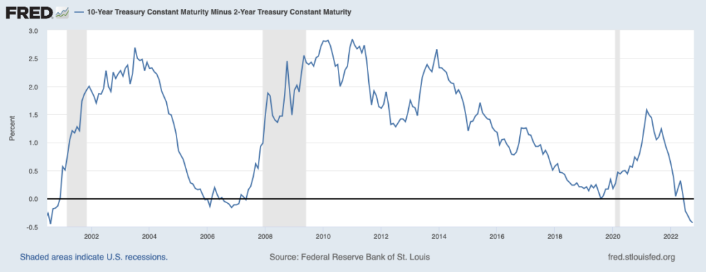 Hodnoty CPI a hospodárske otrasy v Spojenom kráľovstve spôsobili, že výnosy štátnych dlhopisov vzrástli, čo rozšírilo inverziu výnosovej krivky. Dňa 14. októbra vzrástli výnosy dvojročných dlhopisov na 4,509 percenta, čo je pätnásťročné maximum. Od polovice októbra sa inverzia dvojročnej/desaťročnej výnosovej krivky rozšírila približne na 44 bázických bodov (graf 1). To je len o 1 bázický bod menej ako 45 bázických bodov inverzie, ktorá bola naposledy zaznamenaná pred recesiou na začiatku prvého desaťročia 21. storočia. Okrem toho sa trojmesačná/desaťročná výnosová krivka invertovala prvýkrát od roku 2020 (graf 2). Inverzie výnosovej krivky predchádzali recesiám od roku 1955 a svedčia o vyčerpaní krátkodobých úverov. Ako sme už niekoľko mesiacov upozorňovali, príznaky recesie sú jasnejšie ako kedykoľvek predtým.