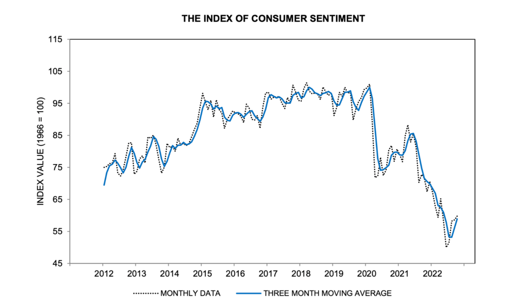 Graf 3: Index nálady spotrebiteľov od roku 2012 do súčasnosti. Zdroj: Michiganská univerzita.