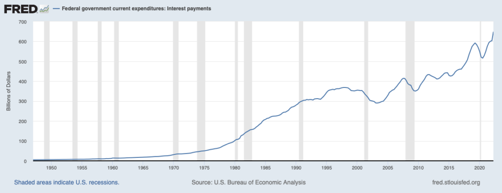 Graf 6: Úrokové platby federálnej vlády USA od roku 1947 do súčasnosti. Zdroj: Americký úrad pre ekonomickú analýzu.
