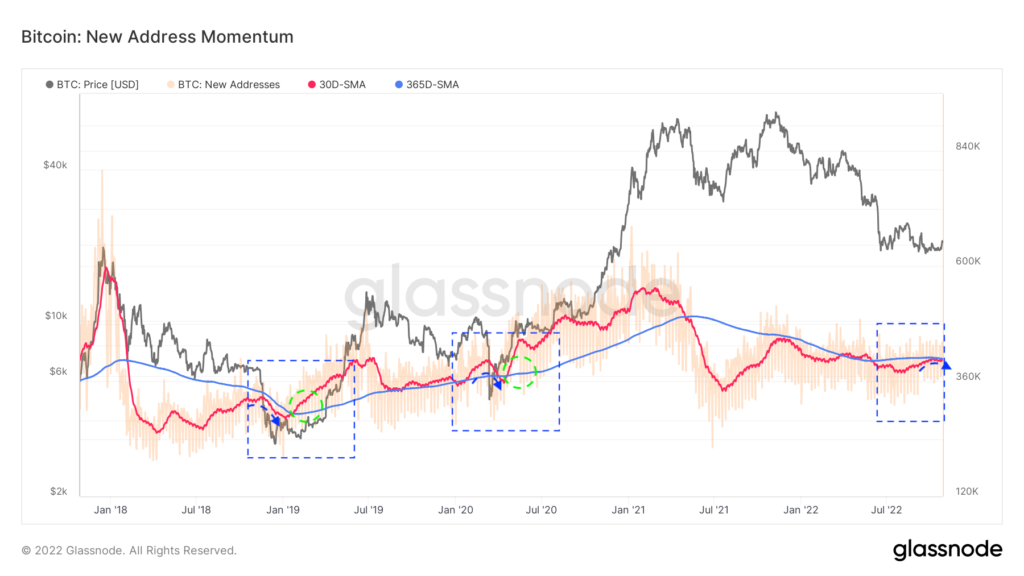 V januári 2019 sa 30-dňový jednoduchý kĺzavý priemer (SMA) začal pomerne agresívne pohybovať nad 365-dňovým; zároveň sa cena BTC pohybovala od 4- do 14-tisíc dolárov. Naopak, keď 30-dňový SMA klesne hlboko pod 365-dňový SMA, ako je to uvedené modrými šípkami vyššie, cenová aktivita bitcoinu má tendenciu klesať, ako to bolo v novembri 2018, keď výpredaj posunul cenu o 50 percent z približne 6 000 dolárov na 3 000 dolárov. Nedávno, koncom septembra a v októbri 2022, sa v priebehu októbra začala zvyšovať hybnosť nových používateľov, ale v posledných dňoch a týždňoch sa zastavila, čo ilustruje mierne klesajúce zakrivenie, ktoré sa začína formovať v 30-dňovom SMA (modrá šípka úplne vpravo). Ak 30-dňový SMA prekročí hranicu 410 000 používateľov a bude odtiaľ pokračovať smerom nahor, mohol by to byť začiatok novej rely. Bitcoin v minulosti vykazoval cenovú silu počas jesenných a zimných mesiacov. Vzhľadom na to, že globálny a makrofinančný naratív zostáva negatívny, je však ťažké predpovedať, ako sa bitcoin bude správať, kým sa nevytvorí jasný naratív pre zotavenie.
