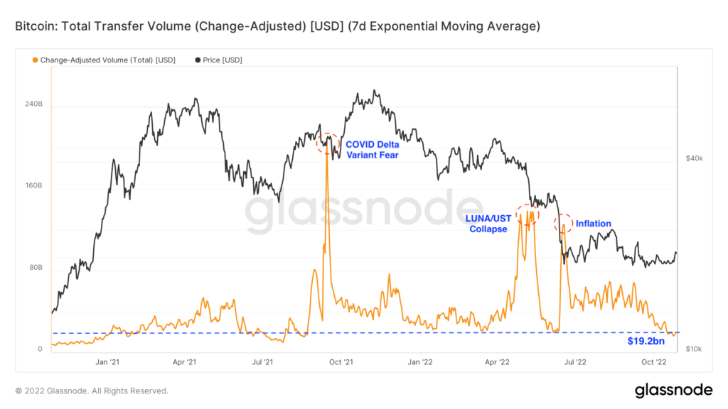 Analýza objemu prevodov môže byť užitočná aj pri porovnávaní podobných trhov. V súčasnosti je objem prevodov na úrovni 19,2 miliardy dolárov a je výrazne pod maximom objemu prevodov z decembra 2017 a len mierne nad minimom z júla 2021. To naznačuje, že aktivita na reťazci je utlmená a potvrdzuje predpoklad, že BTC zažíva pokojné obdobie – aspoň pokiaľ ide o transakcie vyrovnávané na reťazci. Treba poznamenať, že údaje v reťazci nemôžu nevyhnutne odrážať aktivitu derivátov v reálnom čase, pretože tieto transakcie sa nezapisujú do bitcoinového blockchainu.