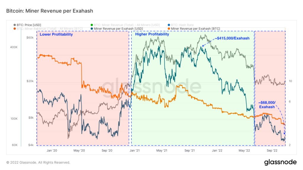 V roku 2021 sa ťažobný priemysel bitcoinov rozrástol a baníci zarábali neuveriteľných 415 000 dolárov za exahash, keďže cena BTC sa vyšplhala na historické maximá. Z uvedeného grafu vyplýva, že tieto zvýšené výnosy začali krátko po rozpolení (halving) bitcoinu – udalosti, ktorá znížila odmenu za ťažbu BTC z 12 BTC za vyťažený blok na 6,25 BTC v máji 2020. Táto úroveň vyššej ziskovosti pokračovala aj v roku 2022, ale od júna postupne klesala. Odvtedy sa výnosy od novembra minulého roka znížili o 84 percent, a to len na 68 000 dolárov za deň za exahash. Výnosy z ťažby nemajú žiadny vplyv na vývoj ceny bitcoinu. Ale vzhľadom na to, že hash rate baníkov v súčasnosti dosahuje nové úrovne, táto miera poukazuje na extrémnu konkurenciu, ku ktorej medzi baníkmi v sieti dochádza.