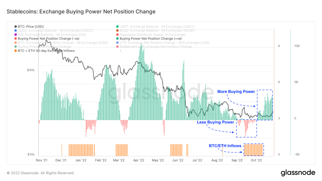 Skúmanie aktivity na burzách môže poskytnúť hlboký pohľad do siete Bitcoin a doplniť analýzu na reťazci pridaním ďalšieho kontextu správania investorov do BTC. Ďalším postrehom, ktorý možno urobiť pri pohľade na údaje z burzy, sú 30-dňové čisté prílevy BTC a ETH v porovnaní s kombinovaným 30-dňovým čistým tokom štyroch najväčších stablecoinov USDT, USDC, BUSD a DAI. Existujú dve zložky, ktoré tvoria nasledujúci graf. V spodnej časti sa nachádza oranžová čiara (alebo séria čiar), keď je tok BTC a ETH kladný. Horná časť sleduje zmenu čistej pozície stablecoinov a vráti zelenú čiaru v dňoch, keď je tok stablecoinov väčší ako hodnota BTC a ETH v dolároch, ktoré prúdia na burzu (väčšia kúpna sila). Naopak, zmena čistej pozície vracia červené čiary v dňoch, keď bolo na burzy vložených viac BTC a ETH (znížená kúpna sila).
